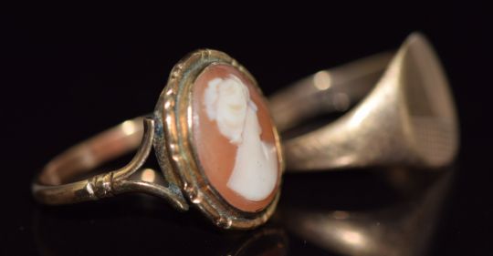 Two 9ct gold rings, one set with a cameo, 4.1g, size I and L/M