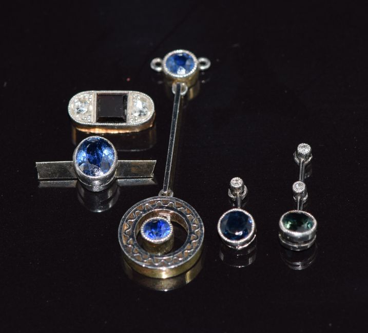 A 15ct gold pendant set with two sapphires with a platinum finish, three mounted sapphires and a mounted sapphire and two diamonds