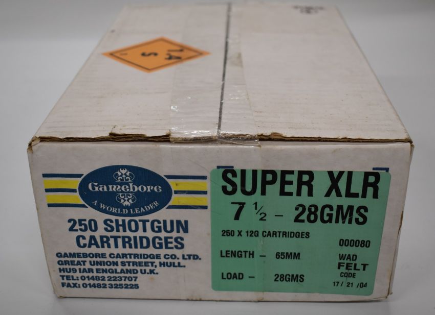 Two-hundred-and-fifty Gamebore Super XLR 12 bore shotgun cartridges, all sealed in original boxes.  PLEASE NOTE THAT A VALID RELEVANT FIREARMS/SHOTGUN CERTIFICATE IS REQUIRED TO HANDLE/PURCHASE THIS ITEM.