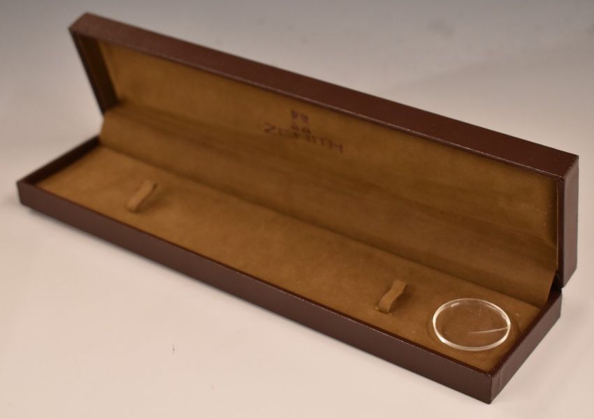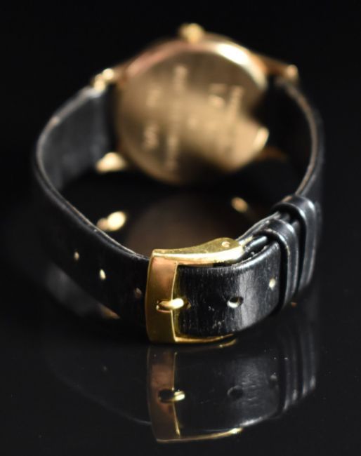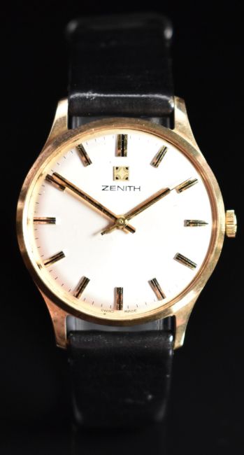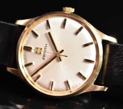 Zenith 9ct gold gentleman's wristwatch ref. 198310 with two tone hands and baton hour markers, silver dial and signed 17 jewel calibre 2572 movement, on black leather strap, case diameter 31mm, serial number 31572, in original box with related paperwork.