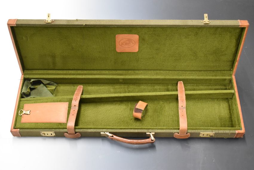 Kite canvas and leather gun case with brass locks, carry handle and padded interior, 80x24x8cm