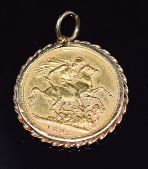 Victoria 1892 gold full sovereign with Melbourne mint mark, in 9ct gold pendant mount, 8.9g