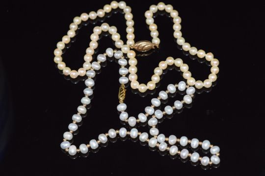 Two single strand cultured pearl necklaces, both with 9ct gold clasps
