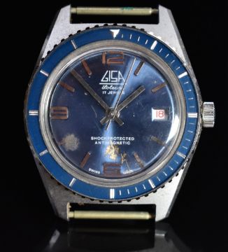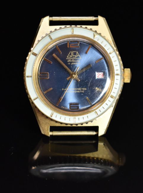 Two Gisa gentleman's diver's style wristwatches each with date aperture and blue dial, one with gold hands, gold plated case and white bezel the other with steel hands, stainless steel case and blue bezel, case diameters 40mm.