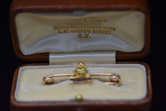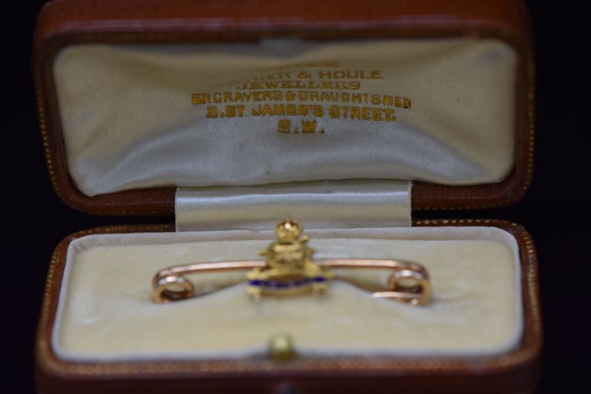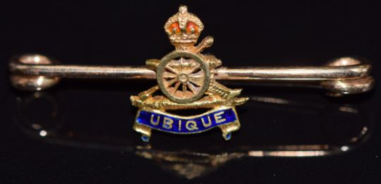 A yellow metal Royal Artillery 'Ubique' sweetheart brooch, 3.1g, 3.5cm long, in original box