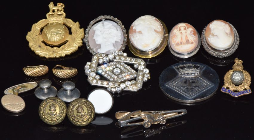 A collection of jewellery including four cameo brooches, a pair of 18ct gold earrings (1.4g), etc