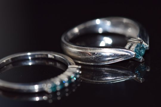 A 14k white gold ring set with five blue diamonds and a 9k gold ring set with a blue diamond solitaire, 5.2g, size N