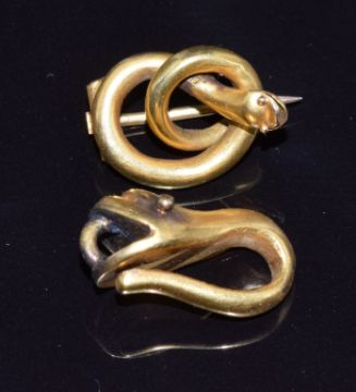 Victorian yellow metal brooch in the form of a snake and a clip in the form of a snake