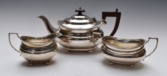 George VI hallmarked silver three piece tea set with gadrooned edge, raised on ball feet, Birmingham 1937 maker Adie Brothers limited, length of teapot 28cm, weight 1121g all in