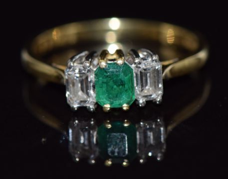 An 18ct gold ring set with an emerald cut emerald and two emerald cut diamonds, approximate diamond weight 0.4ct, 2.5g, size K