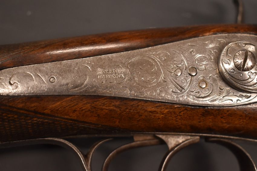 Rossi Italian double barrelled over and under percussion hammer action gun with engraved locks, hammers, butt plate, trigger guard and top plate, chequered grip, sling suspension mounts, brass tipped wooden ram-rod and 36 inch smooth bored Damascus barrels, overall length 132cm.