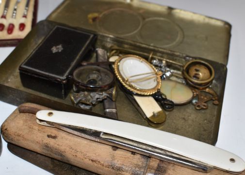 Bijouterie and collectables including hallmarked silver vesta, St. John Ambulance service awards, scissor case, deer slot knife, seals, penknives, hallmarked silver cased folding scissors, silver 3d and other coins, cut throat razor, badges etc
