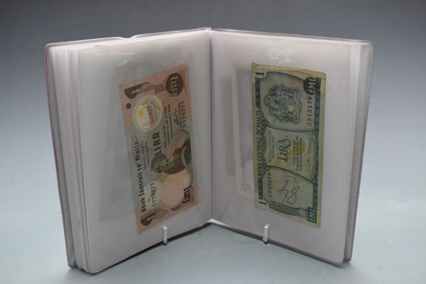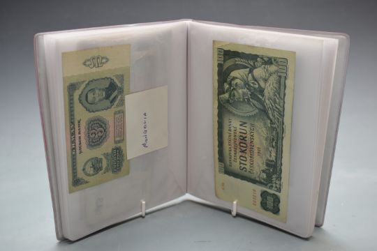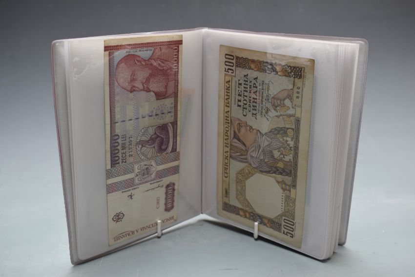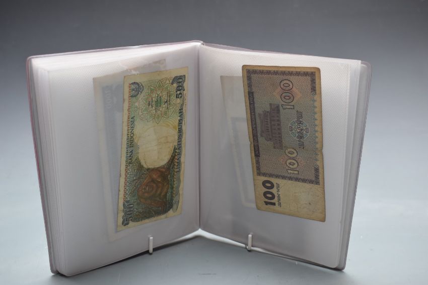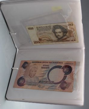 Seventy two used mostly clean world banknotes, in two small albums