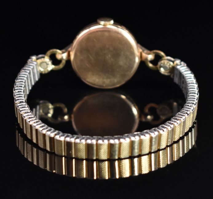 Accurist 9ct gold ladies wristwatch with inset subsidiary seconds dial, gold hands and Arabic numerals, silver dial and signed 21 jewel movement, on expanding metal bracelet, case diameter 22mm.