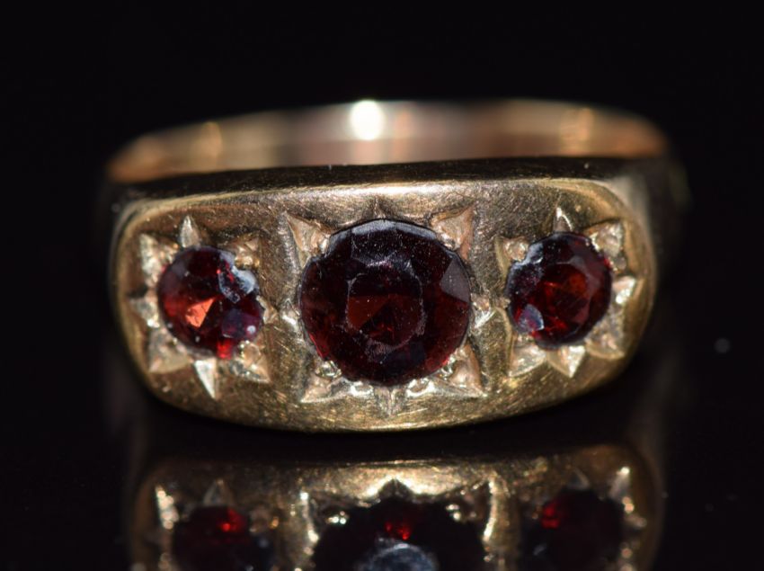 A 9ct gold ring set with three round cut garnets in star settings, 4.2g, size U