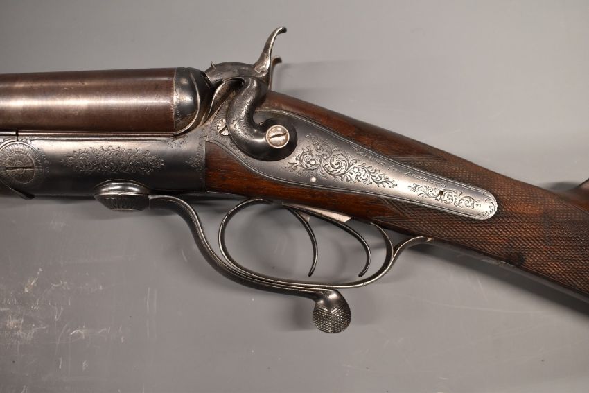 George Emsdorf Walker 12 bore side by side hammer action shotgun with lock engraved 'G E Walker from Purdey's', scrolling engraving to the lock, underside, rotary underlever, stylized dolphin hammer and top plate, chequered grip and forend, double trigger, 30 inch Damascus barrels engraved 'G E Walker Newbury from Purdey's London' and stamped 'J Emme' and cartouche to the underside of the stock engraved with the armorial crest of The Duke of Norfolk, overall length 120cm, length of pull 38cm, serial number 1008. The gun comes with related paperwork and internal photographs including correspondence and research by Bill Harriman.  PLEASE NOTE THAT A VALID RELEVANT FIREARMS/SHOTGUN CERTIFICATE IS REQUIRED TO HANDLE/PURCHASE THIS ITEM.