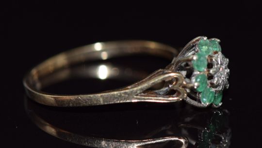 A 9ct gold ring set with a diamond surrounded by emeralds, 1.3g, size M