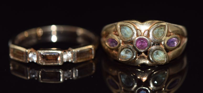 A 9ct gold ring set with topaz and amethyst (size L) and a 9ct gold ring set with quartz, 5.7g, size P