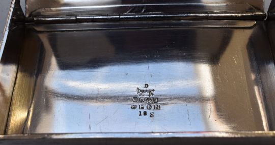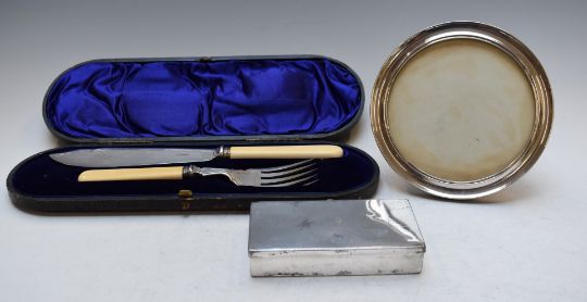 Circular hallmarked silver photograph frame with oak easel back, Birmingham 1922, maker Deykin & Harrison, diameter 16.5cm, silver plated sandwich box and cased silver plated fish servers