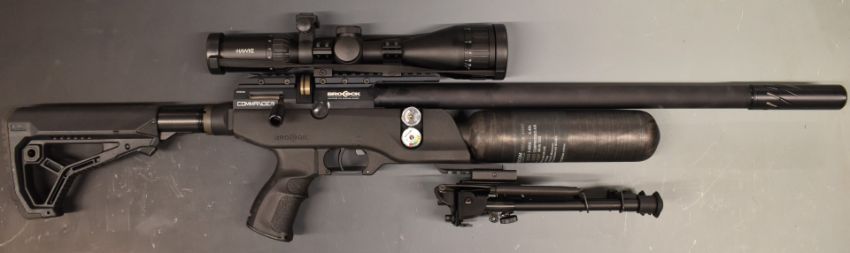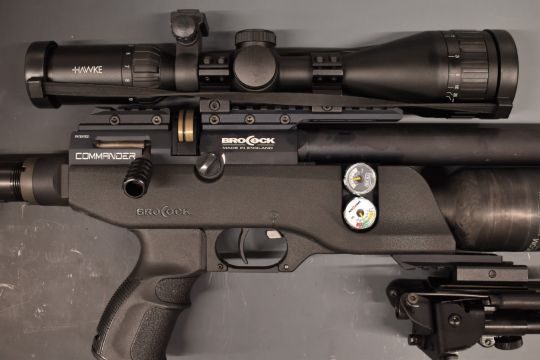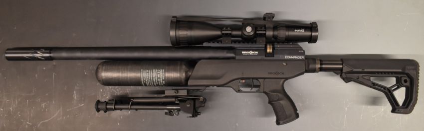 Brocock Commander .177 PCP air rifle with adjustable tactical stock, pistol grip, bi-pod, carbon bottle, sound moderator, 10 shot magazine and Hawke Panorama 4-12x50 scope, serial number NC1113, in flight case with original paperwork.