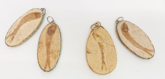 Four fossilised fish pendants