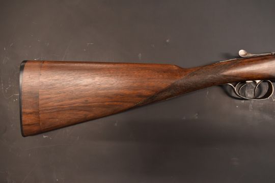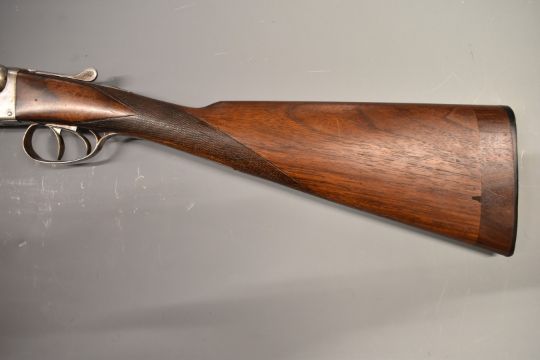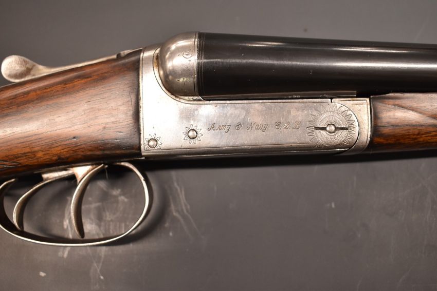 Army & Navy 20 bore side by side shotgun with line engraving to the named locks, trigger guard, underside, top plate, thumb lever and fences, chequered grip, double trigger and 26 inch barrels, overall length 119.5cm, length of pull 38.5cm, serial number 11064.  PLEASE NOTE THAT A VALID RELEVANT FIREARMS/SHOTGUN CERTIFICATE IS REQUIRED TO HANDLE/PURCHASE THIS ITEM.