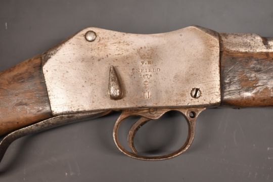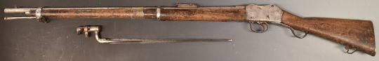 Enfield Martini-Henry .577/450 Mk II falling block underlever service rifle with lock stamped 'Enfield 1878 II' and with crown over VR cypher, pop-up adjustable ladder sights, sling suspension loops, steel butt plate and mounts, 33 inch rifled barrel and associated bayonet, overall length 126cm.