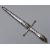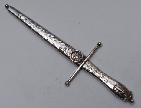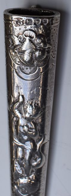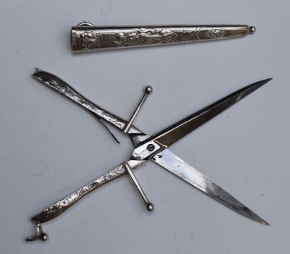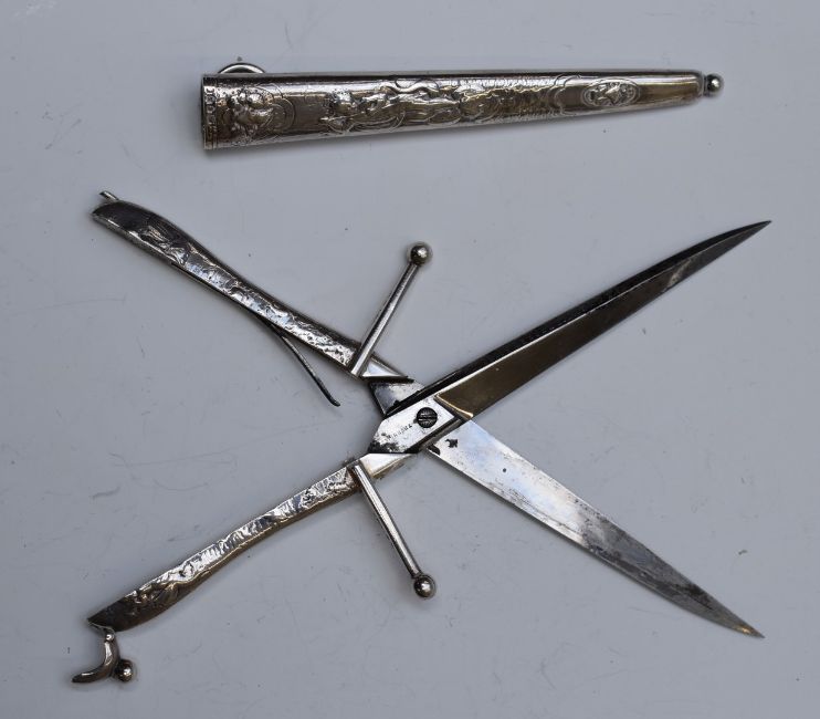 Pair of Victorian hallmarked silver novelty scissors 'The Bucham Dagger Scissors' with spring loaded action restrained by a clip to top of handles, in scabbard with impressed Thornhill retailer's mark and relief decorated with putti and Lily of the Valley, London 1877, maker Thomas Johnson. (Probable misspelling of Bucham / Bircham to blade), length 19.5cm