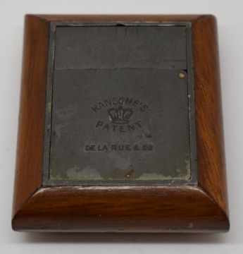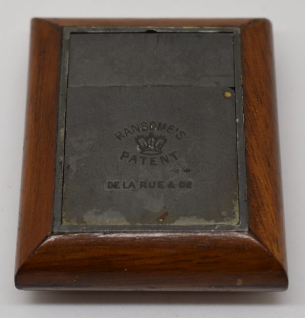 Ransomés patent oak and pewter travelling inkwell retailed by De La Rue, length when stowed 6cm