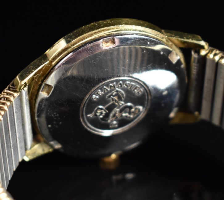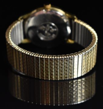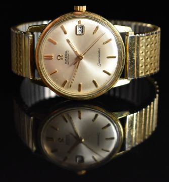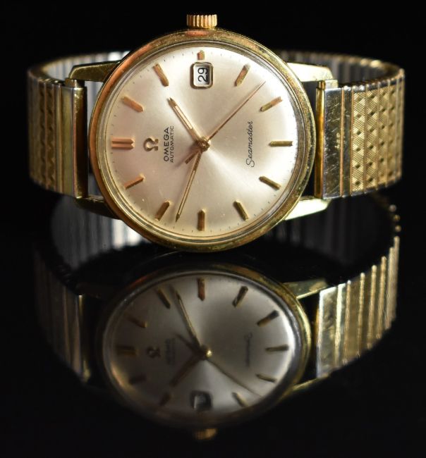 Omega Seamaster gentleman's automatic wristwatch ref. 166.002 with date aperture, luminous gold hands, baton hour markers, silver dial, gold plated case and signed 24 jewel calibre 565 movement, on gold plated expanding bracelet, case diameter 34mm, serial number 24779825, in Rolex style box.