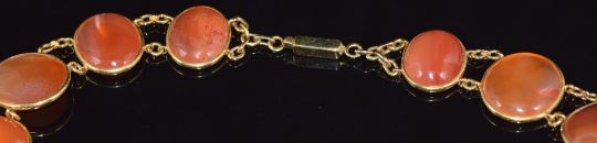 An 18ct gold necklace made up of oval carnelian agate cabochons, 26cm long