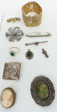 A collection of silver jewellery including brooches, cameo necklace, ring, pendant, etc