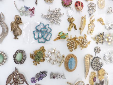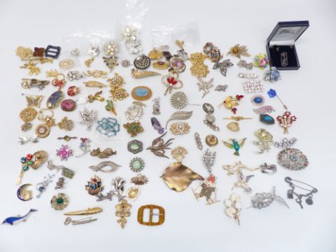 A collection of vintage brooches including silver, diamanté, enamel, etc