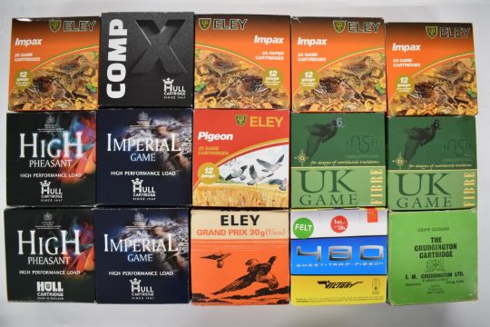Three-hundred-and-thirty-four 12 bore shotgun cartridges including Eley Impax, Eley Pigeon, Eley Grand Prix, Hull, Imperial Game, Hull High Pheasant etc together with 35 16, 20, 28 bore and .410 shotgun cartridges, most in original boxes.  PLEASE NOTE THAT A VALID RELEVANT FIREARMS/SHOTGUN CERTIFICATE IS REQUIRED TO HANDLE/PURCHASE THIS ITEM.