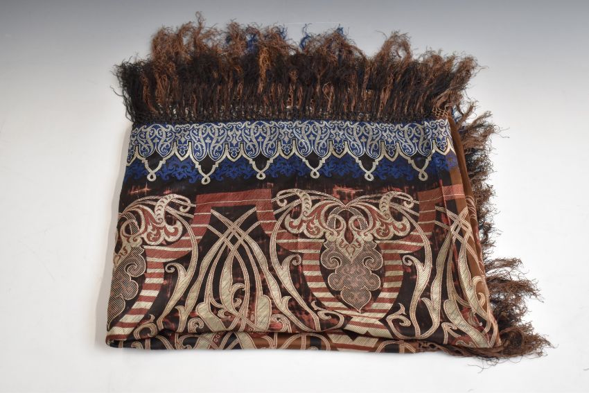Victorian / Edwardian woven silk shawl with Art Nouveau / Secessionist pattern and hand woven fringe, 190 x 180 cm
