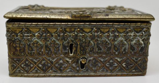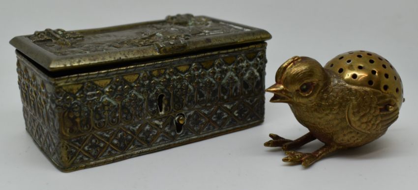 Novelty bronze or similar bird with swivel compartment to rear having filler to base, together with a triple stamp case with George and the dragon to lid, L7.5cm