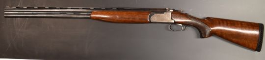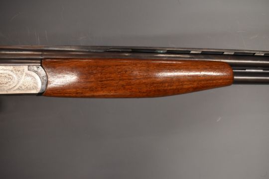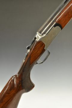 Lanber 12 bore over and under ejector shotgun with engraved lock, trigger guard, underside, top plate and thumb lever, chequered semi-pistol grip, single trigger, vented top and central ribs and 27.5 inch multi choke barrels, overall length 114cm, length of pull 37cm, serial number 299105. PLEASE NOTE THAT A VALID RELEVANT FIREARMS/SHOTGUN CERTIFICATE IS REQUIRED TO HANDLE/PURCHASE THIS ITEM.