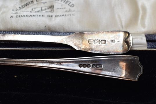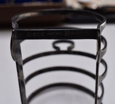 Cased hallmarked silver spoon, further hallmarked silver fiddle pattern teaspoon, weight 57g, hallmarked silver inkwell base, diameter 11cm, plated vesta cases, plated knife rests etc