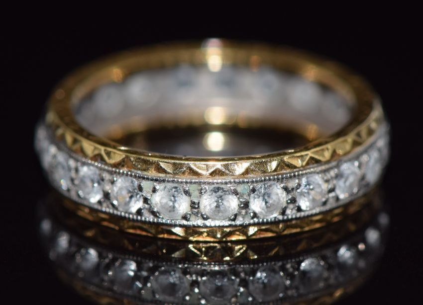 An 18ct gold eternity ring set with paste, 4.6g, size N/O