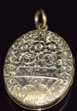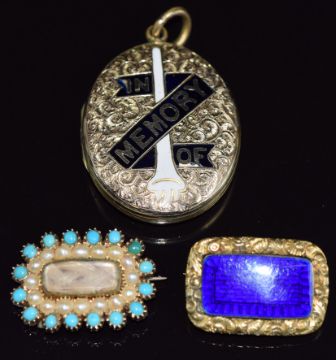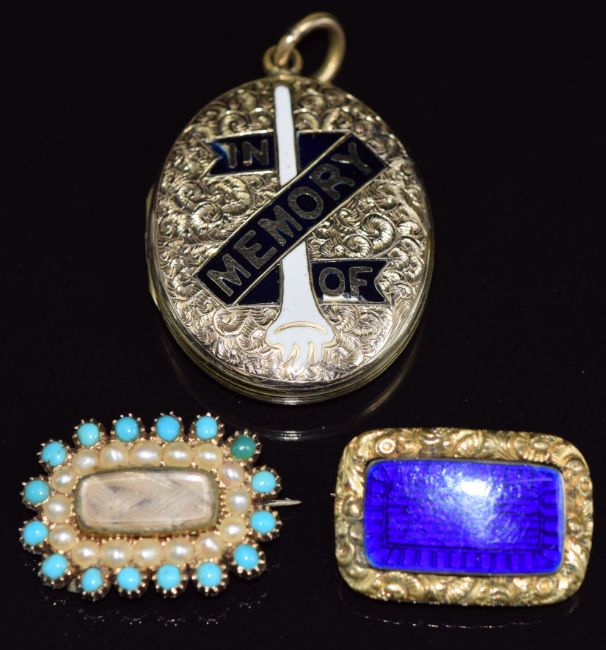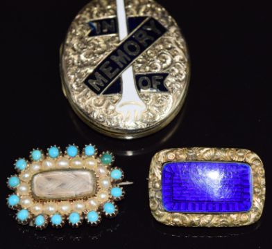 An early 20thC mourning locket with engraved floral decoration set with enamel reading 'In Memory Of' and two mourning brooches, one set with blue enamel and the other hair, seed pearls and turquoise