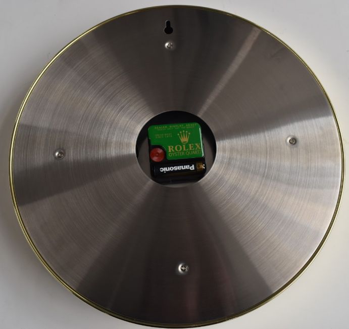 Rolex Oyster Perpetual Daytona shop display or advertising wall clock with white dial, tachymetre bezel and gold plated case, case diameter 34cm