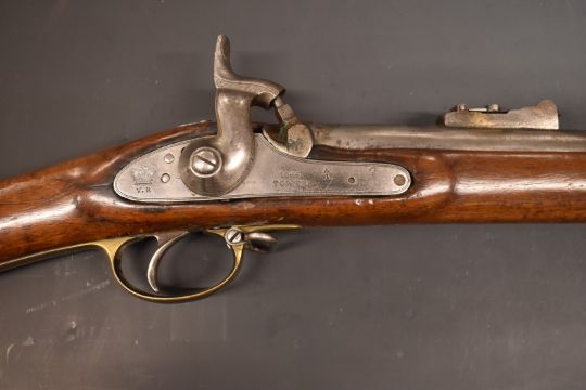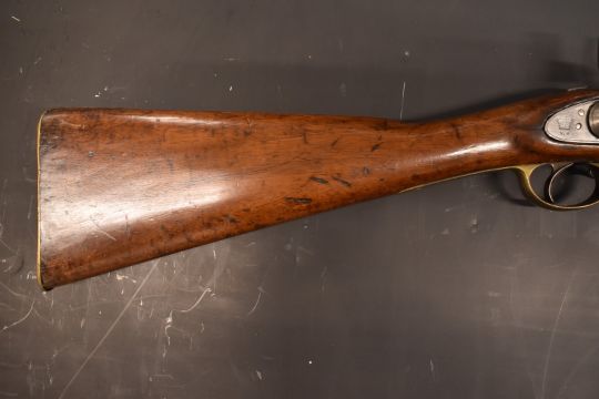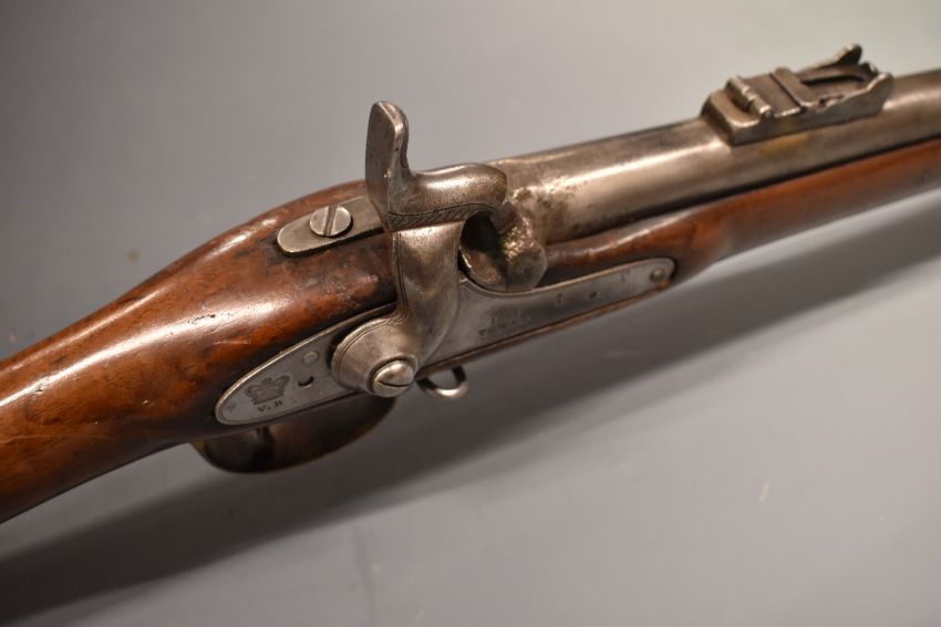Enfield pattern three band 16 bore percussion hammer action gun with lock stamped with crown over 'VR' cypher and '1864 Tower', engraved hammer, brass trigger guard, butt plate and mounts, steel ram-rod, pop-up ladder sights, sling suspension loops and 39 inch smooth bored barrel, overall length 140cm.