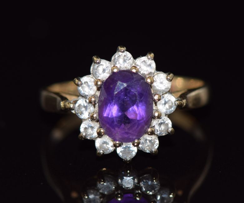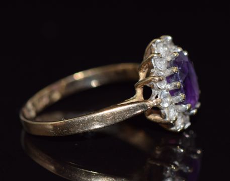 A 9ct gold ring set with an oval cut amethyst surrounded by cubic zirconia, 2.6g, size O
