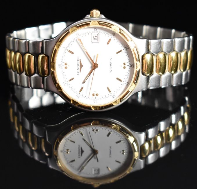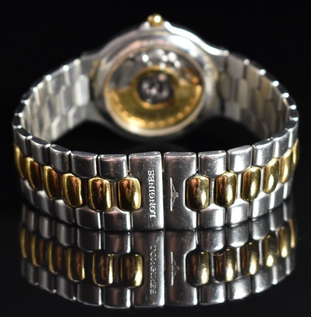 Longines Conquest gentleman's automatic wristwatch ref. L1.620.3 with date aperture, luminous gold hands, gold hour markers and bezel, white dial, exhibition case back and signed 21 jewel movement, on two-tone bracelet, case diameter 35mm.