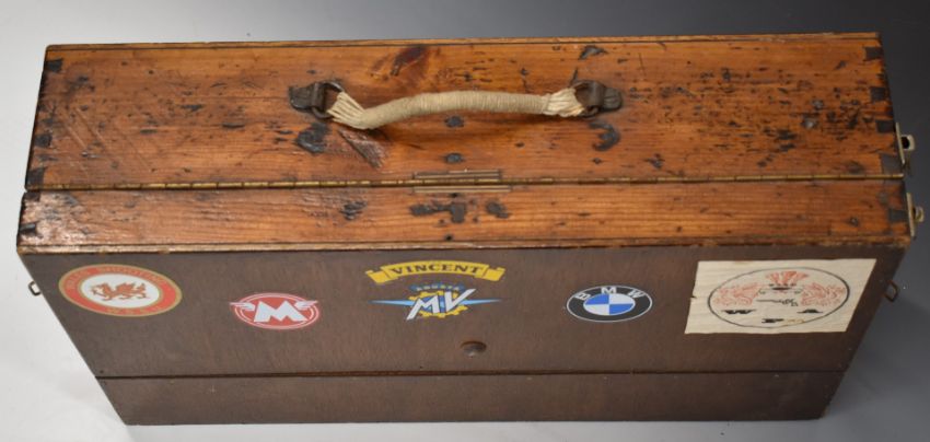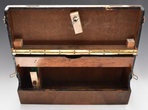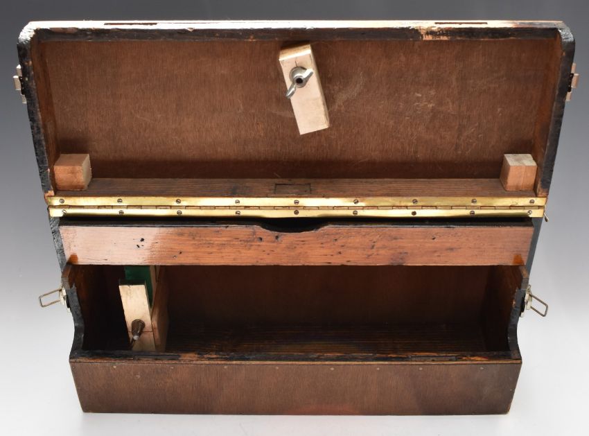 A wooden pistol shooting range box with fitted interior and carry handle, 52x28x15cm.