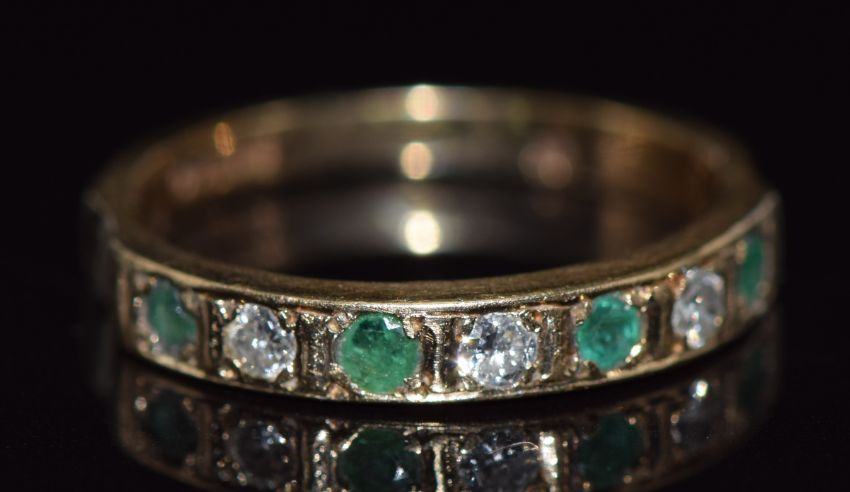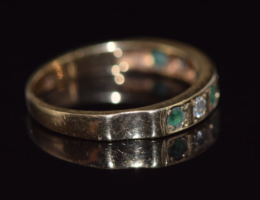 A 9ct gold half eternity ring set with round cut emeralds and diamonds, 1.5g, size I