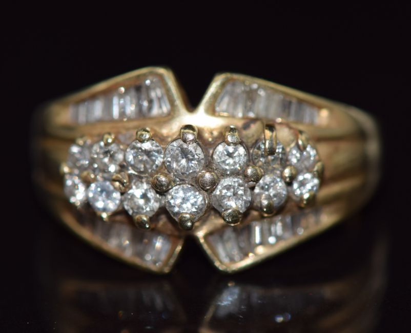 A 14k gold ring set with round and baguette cut diamonds, 6g, size O