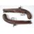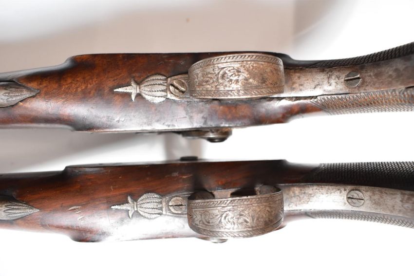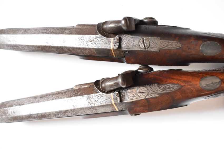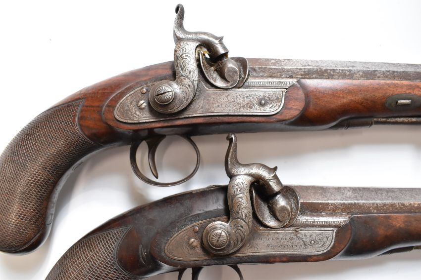 A pair of percussion hammer action pistols with locks signed 'Backwell Devonport', ornately engraved locks, hammers, trigger guards and mounts, chequered grips, captive steel ram-rods, vacant wrist cartouches and gold line inlaid and engraved 6.25 inch smooth bored octagonal barrels, overall length 30cm.