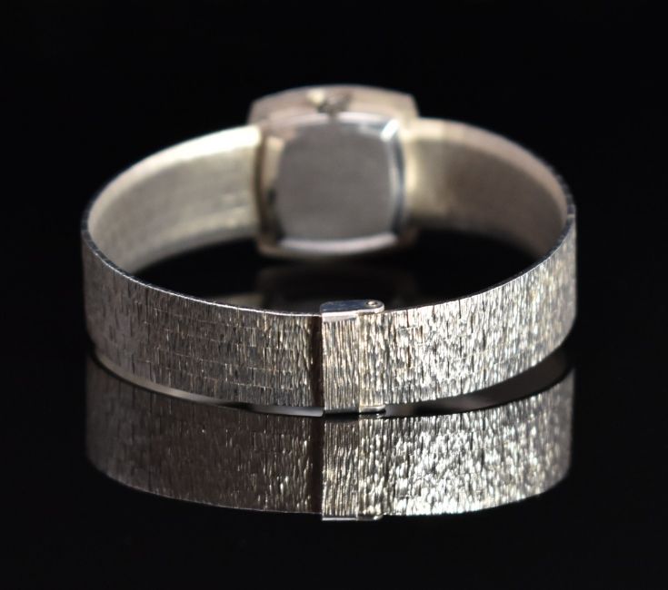 Bueche Girod 9ct white gold ladies wristwatch with black hands and baton markers, textured dial and bezel and 17 jewel movement, on integral 9ct gold textured bracelet, case diameter 22mm, 35.3g.