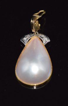 A 9ct gold pendant set with a pearl and diamonds, 3.4g